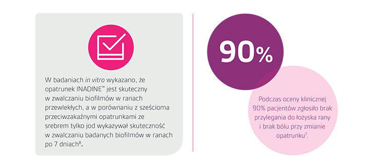 Jod od ponad 170 lat jest uznanym środkiem antyseptycznym w praktyce klinicznej - działa przeciwbakteryjnie, przeciwwirusowo i przeciwgrzybiczo. INADINE™ tworzy wokół rany środowisko antyseptyczne, sprzyjające gojeniu i redukujące ryzyko zakażeń.