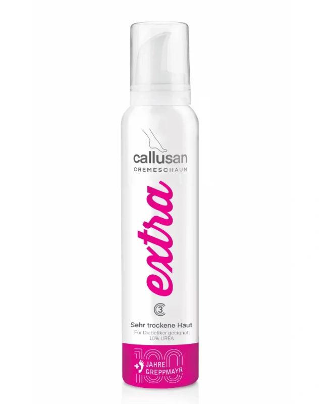 Callusan EXTRA to krem w piance do intensywnej pielęgnacji bardzo suchej, popękanej, zrogowaciałej i łuszczącej się skóry stóp. Formuła pomaga chronić przed utratą wody w głębszych warstwach naskórka, wspiera redukcję suchości i poprawę komfortu skóry. Pianka wchłania się szybko i nie pozostawia tłustego filmu.