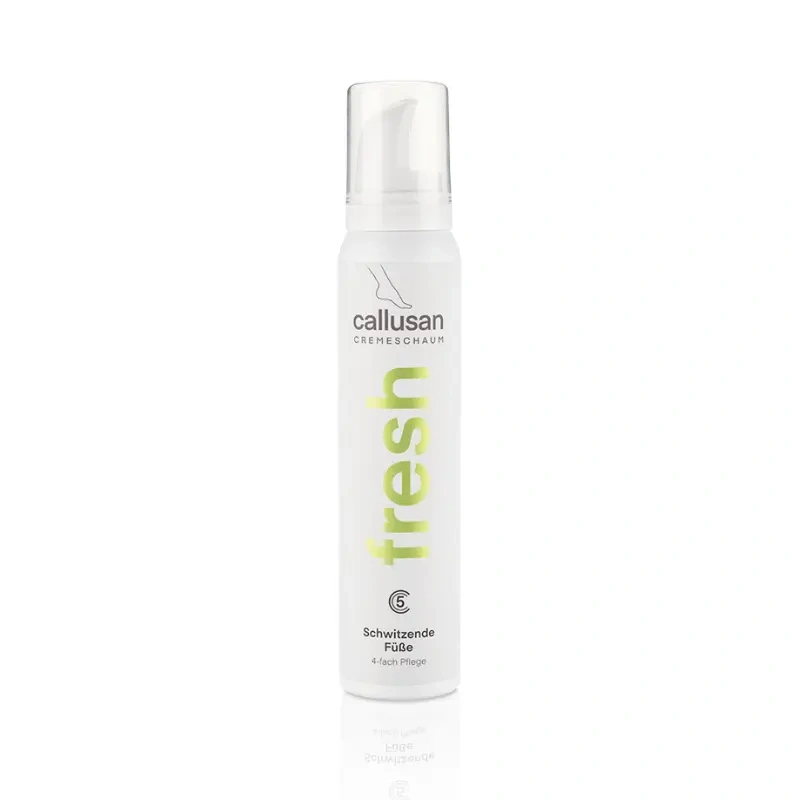 Callusan FRESH to czterofazowy krem w piance do codziennej pielęgnacji stóp z tendencją do nadmiernej potliwości. Jest przeznaczony dla osób aktywnych, sportowców oraz tych, którzy długo noszą zamknięte obuwie i chcą ograniczyć wilgoć oraz nieprzyjemny zapach. Lekka pianka szybko się wchłania i wspiera komfort skóry stóp.