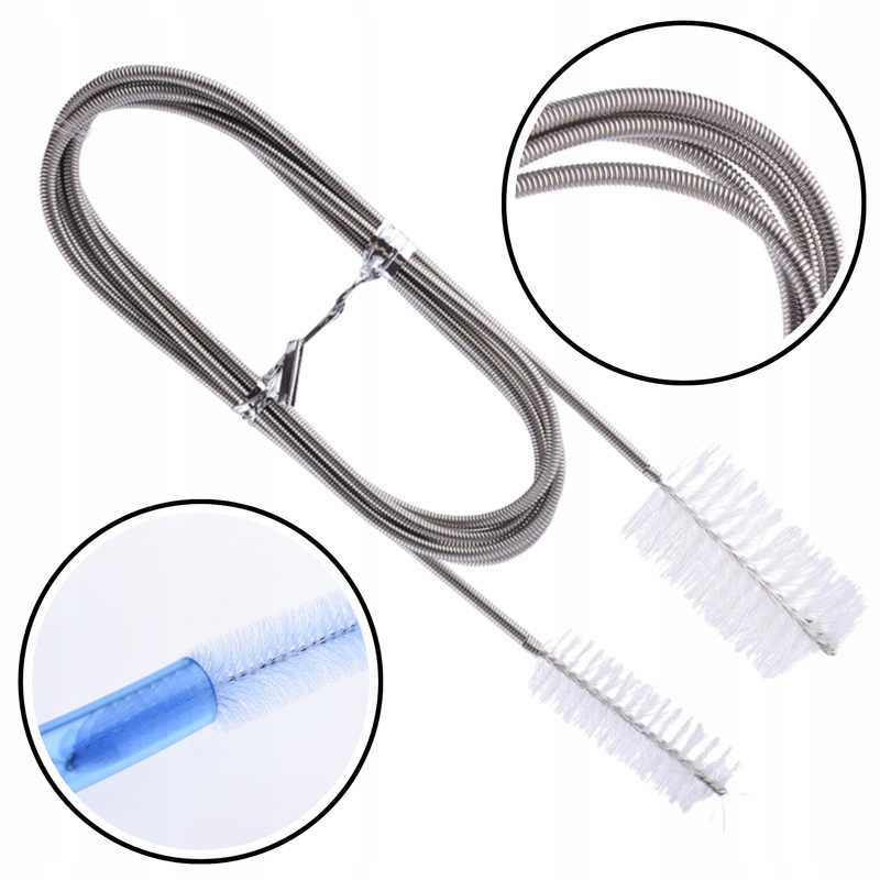 Dwustronna konstrukcja z dwiema szczotkami o różnej średnicy pozwala na dokładne oczyszczenie przewodów o różnej szerokości, a elastyczna stalowa linka ułatwia dotarcie nawet do zakrzywionych odcinków węża.